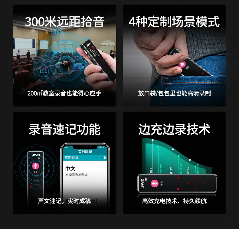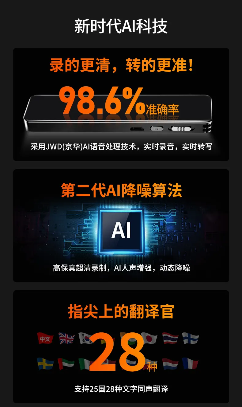 高清原聲音質(zhì),AI降噪體驗(yàn),拾音速記轉(zhuǎn)寫(xiě),25國(guó)同聲轉(zhuǎn)譯,支持邊充邊錄