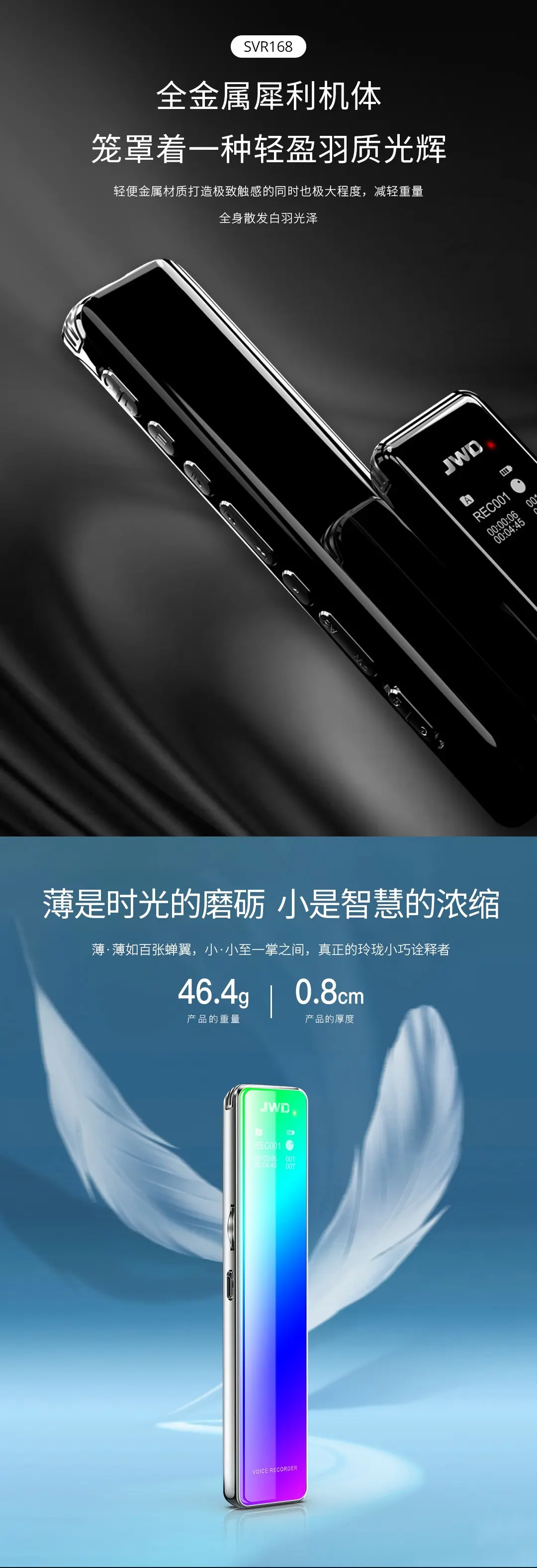 全金屬機體,智能數(shù)字化降噪輸入,聲控/定時/分段多樣錄音,四配色可選