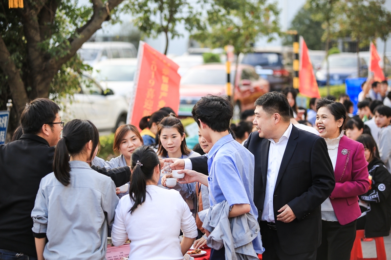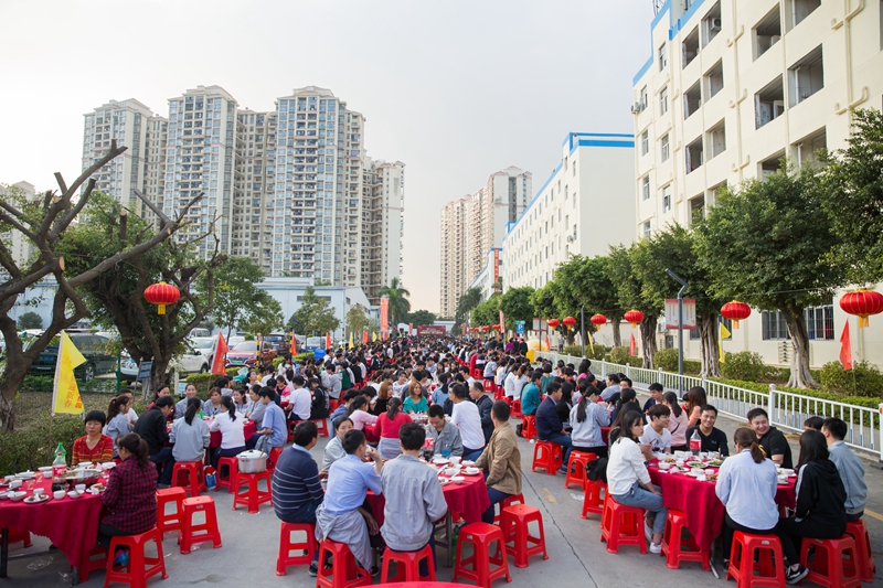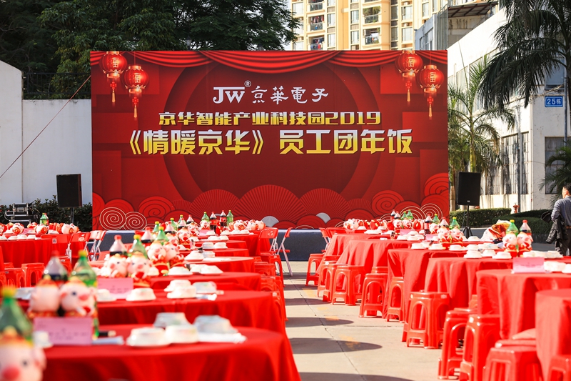 2019年1月11日下午,鳥語花香、陽光明媚。京華智能產(chǎn)業(yè)科枝園區(qū)彩旗獵獵,燈籠高掛,處處張燈結(jié)彩,一副熱鬧非凡、美輪美奐的景象。遠遠望去,京華大道上綿延幾百米,整齊地排列著160張鋪著大紅臺布的餐桌,猶如幾條巨大無比的彩帶在京華科技園區(qū)飛舞,場面頗為壯觀。