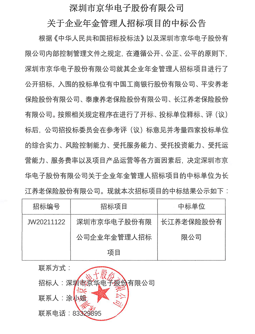 深圳市京華電子股份有限公司企業(yè)年金基金管理人招標(biāo)公告
